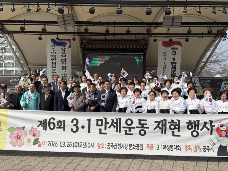 공주시(시장 최원철)는 26일 산성시장 일원에서 제107주년 3·1절을 맞아 ‘제6회 공주 3·1만세운동 재현 행사’를 개최하고, 시민들과 함께 독립정신을 되새기는 시간을 가졌다. 이번 행사는 3·1여성동지회 공주지회(회장 정금선)가 주관하였으며, 독립유공자 유족, 보훈단체장, 시민과 학생...