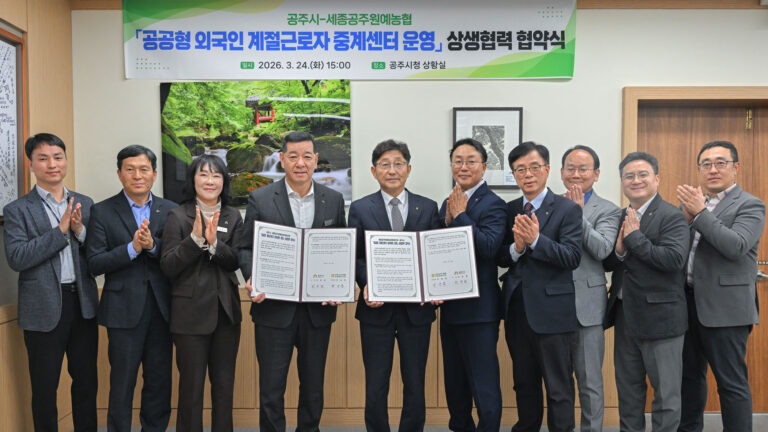공주시(시장 최원철)는 지난 24일 시청 상황실에서 세종공주원예농협과 농촌 일손 부족 해소를 위한 ‘공공형 외국인 계절근로자 중개센터 운영 업무협약’을 체결하며 농가 지원에 본격적으로 나섰습니다. 이번 협약은 농촌 인구 감소와 고령화로 인력...