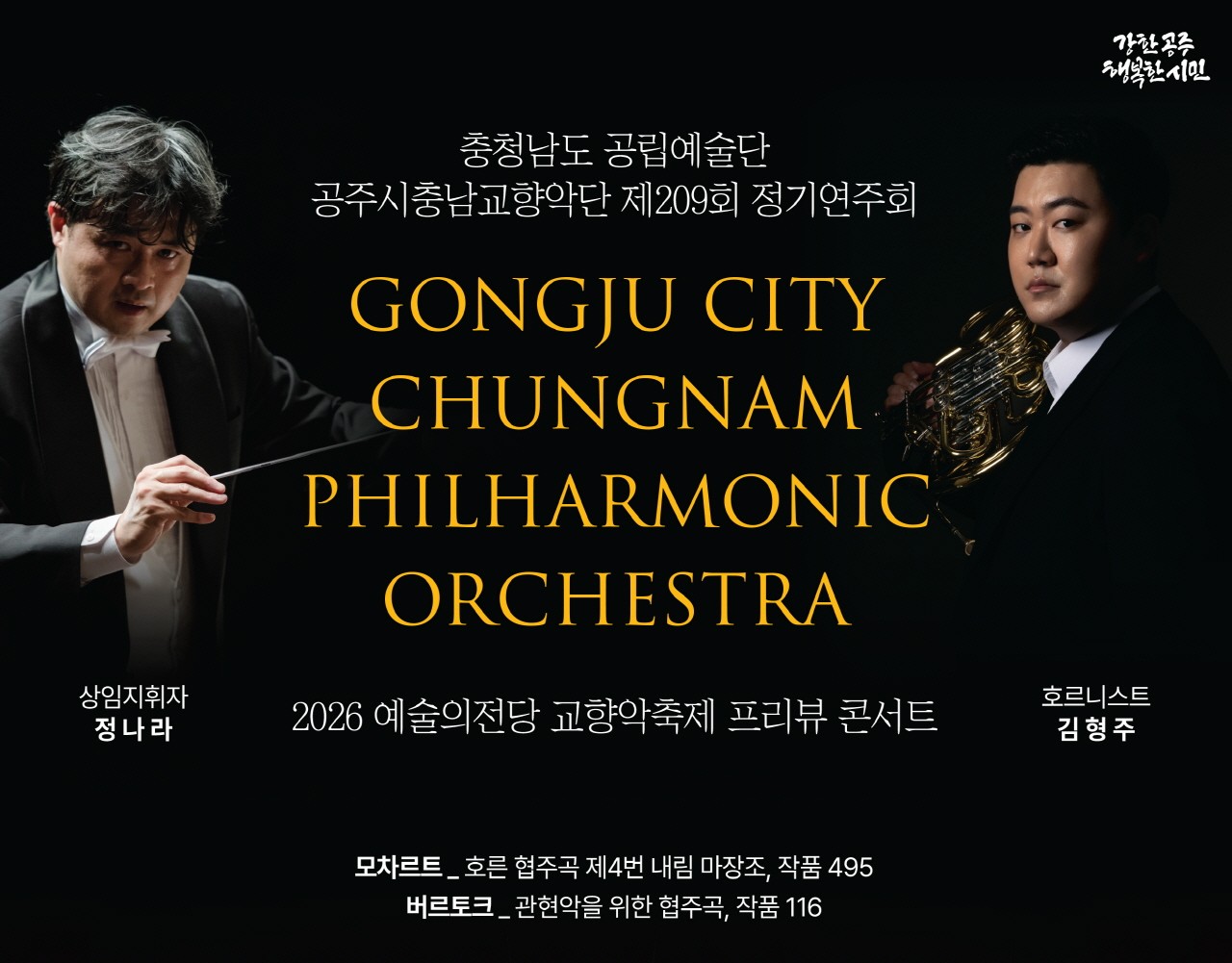 교향악축제 프리뷰 공연… 웅장한 오케스트라 감동 선사 공주시충남교향악단는 오는 4월 17일 오후 7시 30분 공주문예회관 대공연장에서 ‘제209회 정기연주회’를 개최한다고 밝혔다. 이번 공연은 ‘2026 예술의전당 교향악축제’ 참가에 앞서 지역 음악 애호가들에게 먼저...