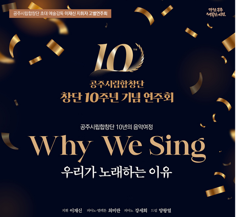 이번 연주회는 창단 10주년을 맞아 ‘Why We Sing(우리가 노래하는 이유)’라는 타이틀로 6세 이상이면 누구나 관람이 가능하며, 14일부터 27일 오후 5시까지 예매한 사람에게는 전석 무료다. 공연문의는 공주시립합창단 (041-852-8590)으로 하면 된다. (공주뉴스-이정미기자)