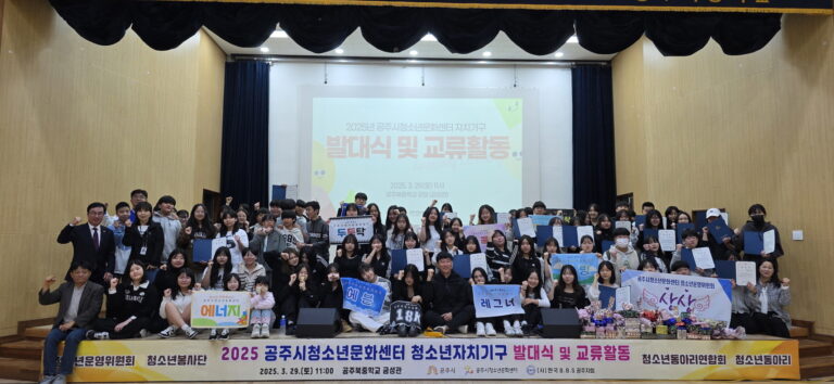 공주시청소년문화센터(관장 이미경)는 지난 29일 공주북중학교 금성관에서 청소년자치기구 발대식을 개최하고 청소년들 간의 교류 활동을 펼쳤다고 밝혔다. 청소년자치기구 간 협업과 교류를 도모하고, 소속감을 형성하여 청소년들에게 긍정적인 활동 동기를 부여하기 위해 마련된 이날 발대식에는 청소년운영위원회, 동아리, 자원봉사단 소속의 청소년 100여명이 참여했다.
