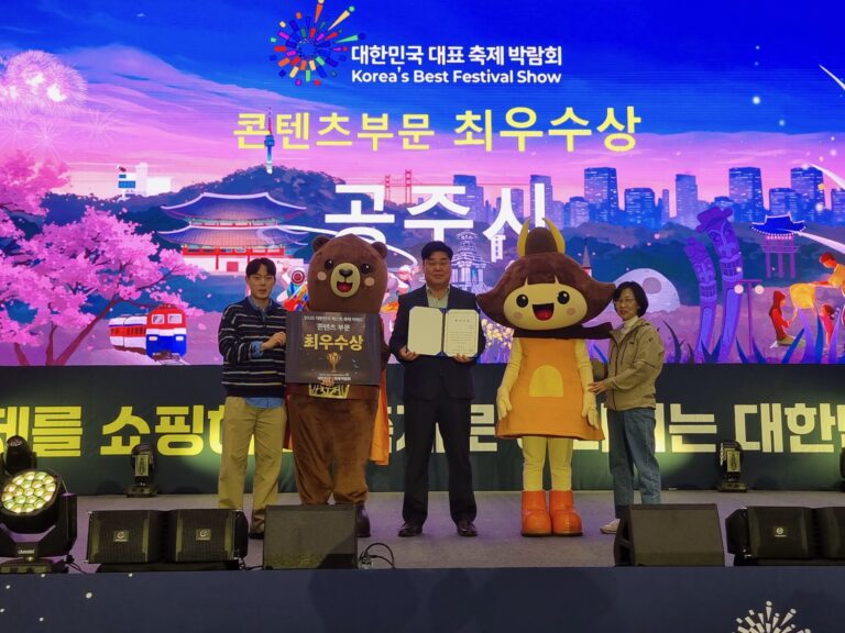 공주시(시장 최원철)가 ‘제5회 대한민국 대표 축제박람회’에서 콘텐츠 부문 ‘최우수상’을 수상했다. 시에 따르면, 전국의 축제들이 한자리에 모여 홍보하고 발전방향을 모색하는 대한민국 대표 축제박람회가 지난 21일부터 23일까지 부산 벡스코 제1전시장에서 열렸으며 사흘간 4만2천여명이 방문하며 큰 관심을 받았다.