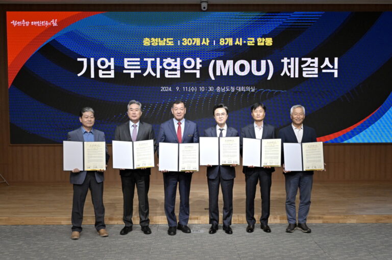 공주시(시장 최원철)가 적극적인 기업 유치 활동에 힘입어 4개 기업을 유치하는 값진 성과를 냈다. 공주시는 11일 충남도청 대회의실에서 김태흠 도지사와 최원철 시장 등이 참석한 가운데 공주, 천안, 아산 등 8개 지자체와 30개 기업이 합동 투자협약을 체결했다.