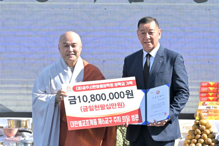 대한불교조계종 제6교구 신원사(주지 의당 성관)에서 공주 지역인재 육성과 생활 형편이 어려운 학생들을 위해 써달라며 장학금 1,080만원을 공주시한마음장학회(이사장 최원철)에 전달했다. 신원사 주지 의당 성관은 지난 5일 진행된 ‘신원사 중악단 명성황후 추모제’ 행사에서 별도의 장학기금 전달식을 하고 최원철 시장에게 1080만원의 장학금을 전달했다.