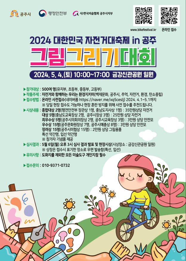 ‘2024 대한민국 자전거대축제 in공주’ 행사가 열리는 충남 공주시에서 환경 사랑 전국 그림그리기 대회가 열린다. 26일 공주시에 따르면, 이번 대회는 5월 4일 오전 10시부터 오후 5시까지 금강신관공원 일원에서 개최된다.