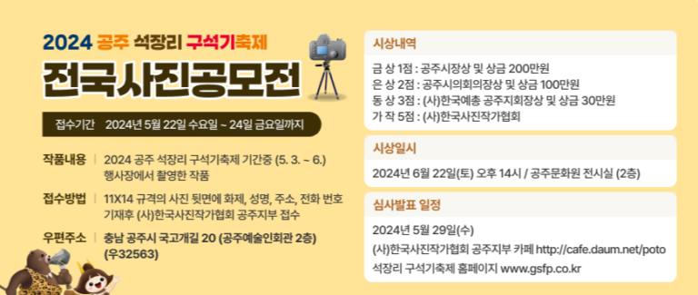 홈 문화/스포츠 사회 생활정보 석장리 구석기 축제 사진 공모전 24일까지 제출해야 작성자 공주뉴스 등록 2024년 05월 23일 지난 5월 3일부터 공주 석장리에서 진행된 ‘석장Re(ㄹ) 1964), 구석기 세계로!’ 행사를 주제로 한 사진대회 전수가 시작됐다. 시상은 금, 은, 동, 가작으로 나누고 총상금은 490만원이다. 접수기간은 5월 22일부터 24일까지로 5월 29일 발표된다. 시상식은 내달 22일 공주문화원 2층 전시실에서 열릴 예정이다. (공주뉴스=이정미기자) 작성자 공주뉴스 뒤로가기