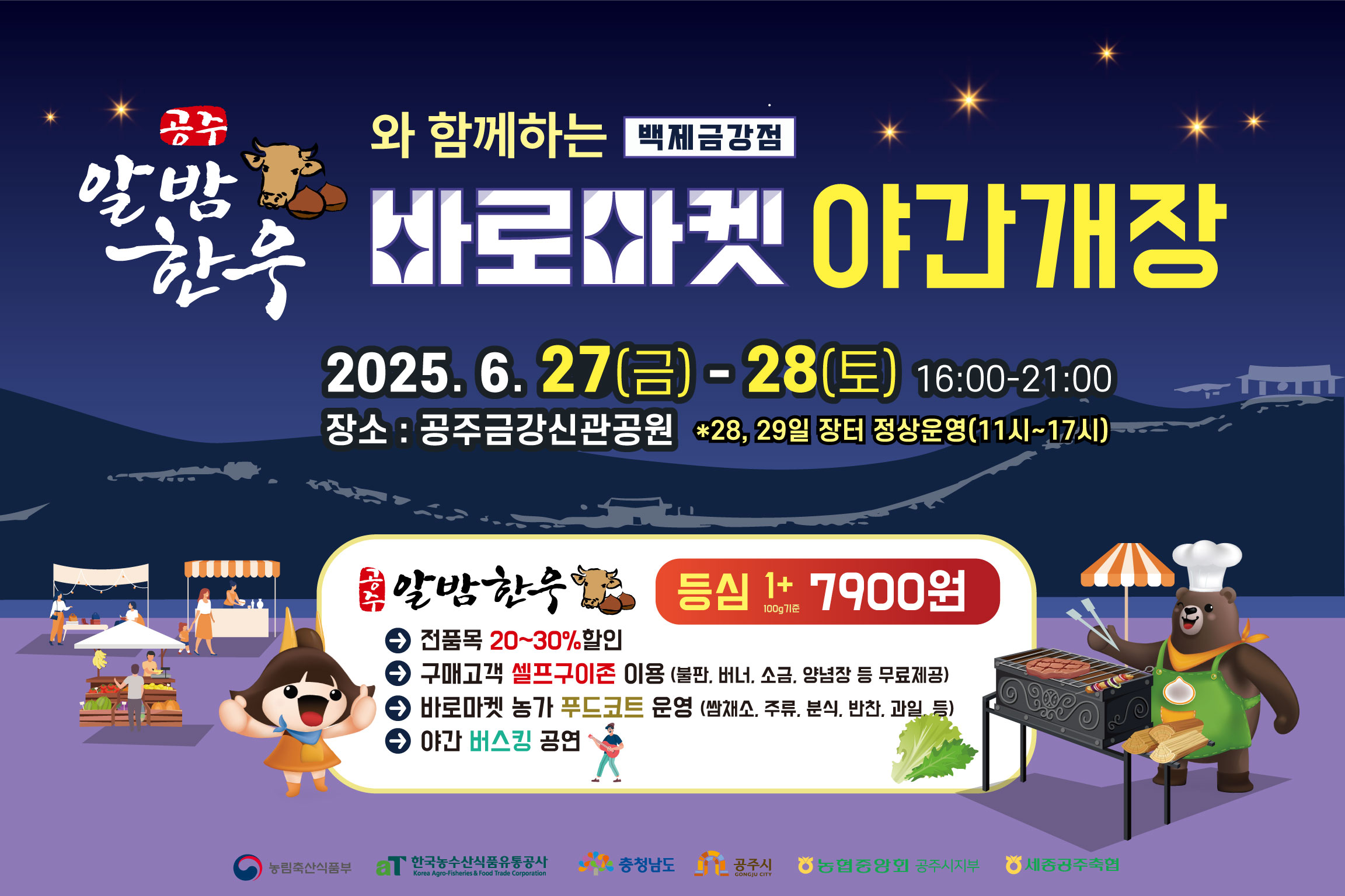 무더운 여름밤, 금강에서 즐기는 프리미엄 공주알밤한우의 특별한 맛 공주시(시장 최원철)는 광역 직거래 장터인 ‘바로마켓 백제금강점’을 오는 6월 27일(금)과 28일(토) 양일간 오후 4시부터 밤 9시까지 야간 개장한다고 밝혔다. 이번 야간 장터는 공주시...