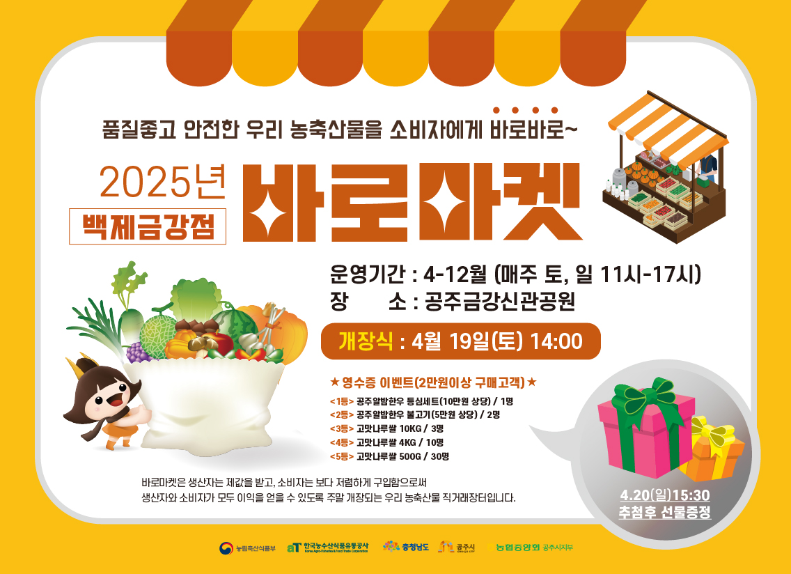 신선한 먹거리, 즐거운 문화가 함께하는 주말 장터 공주시(시장 최원철)는 지역 농업인과 소비자를 직접 연결하는 광역 직거래 장터 ‘바로마켓 백제금강점’을 오는 4월 19일부터 본격 운영한다고 밝혔다. 시에 따르면, 바로마켓 백제금강점은 지역 농산물...