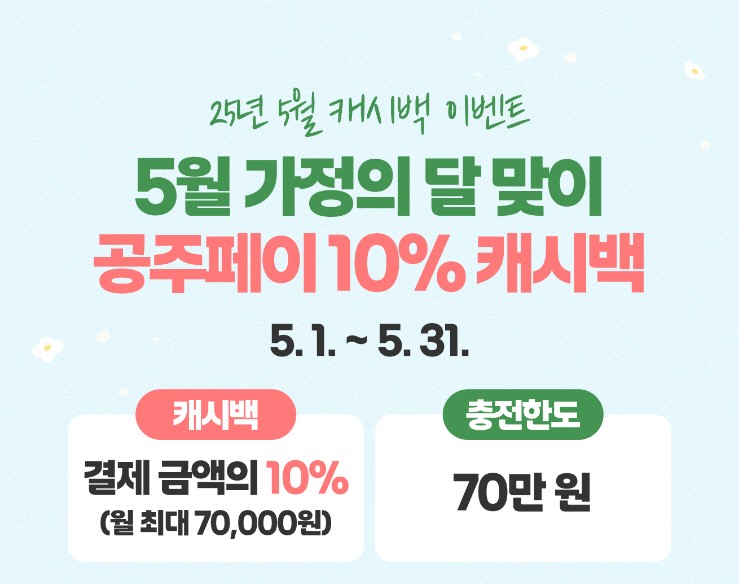 가정의 달과 공주 석장리 구석기축제 맞아 지역경제 활성화 도모 공주시(시장 최원철)는 가정의 달을 맞아 5월 한 달간 ‘공주페이’ 캐시백 지원율을 기존 5%에서 10%로 한시 상향한다고 밝혔다. 시는 5월 가정의...