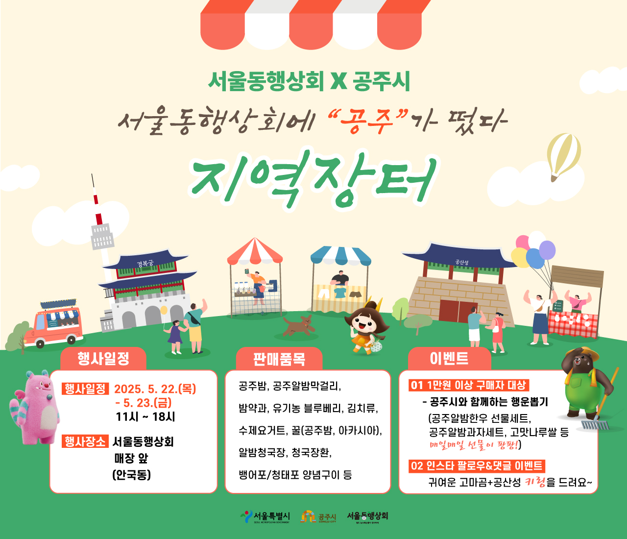 서울 동행상회 외부장터에서 밤약과·막걸리·김치 등 다양하게 선보여 공주시(시장 최원철)는 오는 5월 22일부터 23일까지 이틀간 서울 종로구 안국동에 위치한 ‘서울동행상회’ 외부 장터에서 공주시 우수 농·특산물 홍보 판촉 행사를 연다고 밝혔다. 이번...