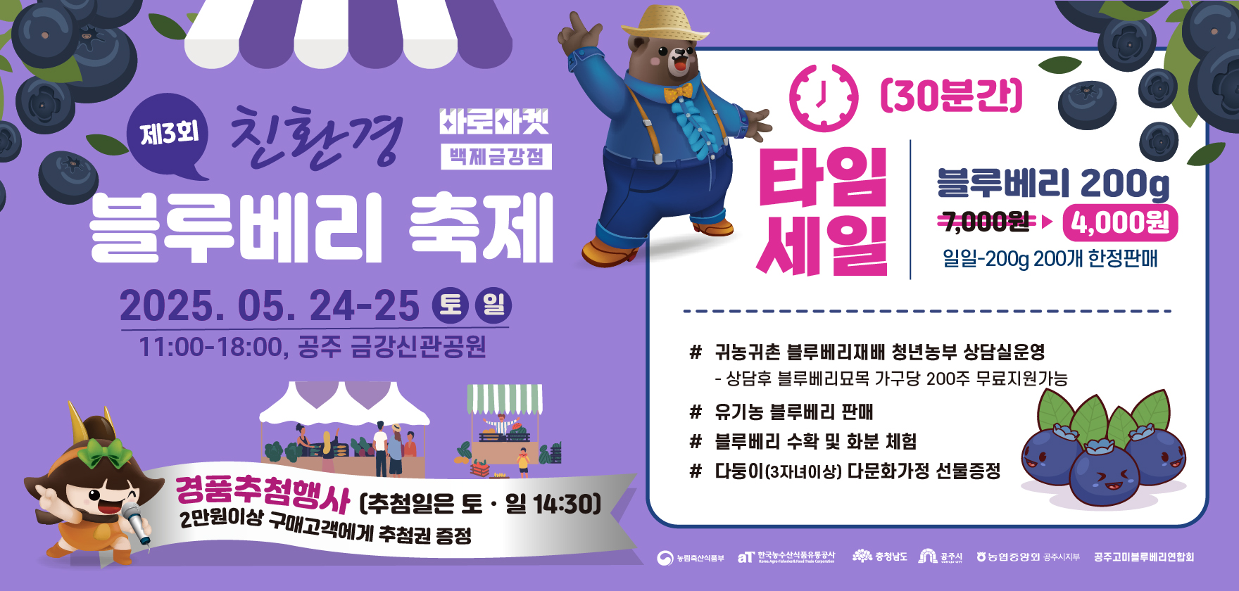 지역농가와 함께하는 보라색의 건강한 선물, 블루베리 향연 공주시(시장 최원철)는 오는 24일과 25일 이틀 동안 공주 금강신관공원에서 ‘제3회 친환경 블루베리 축제’를 연다고 밝혔다. 이번 축제는 지역 친환경 농산물의 우수성을 널리 알리고 지속...