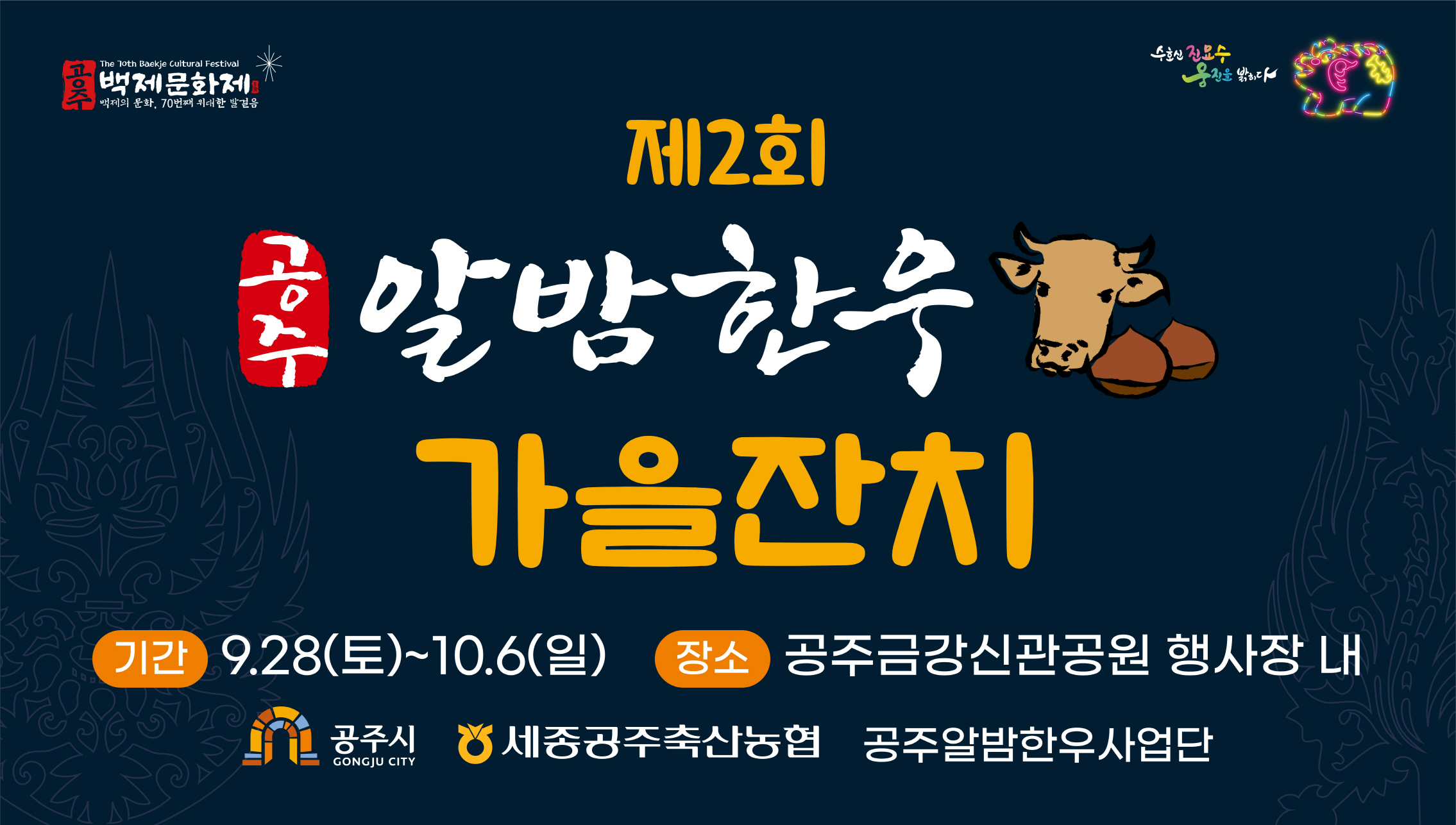공주 금강신관공원에서 한우 직거래 장터 등 공주알밤한우 홍보 공주시(시장 최원철)가 주최하고 공주알밤한우사업단·세종공주축협이 주관하는 ‘제2회 공주알밤한우 가을잔치’가 제70회 백제문화제 기간 개최된다. 시는 백제문화제가 열리는 9월 28일부터 10월 6일까지 9일간 공주 금강신관공원 행사장에서...