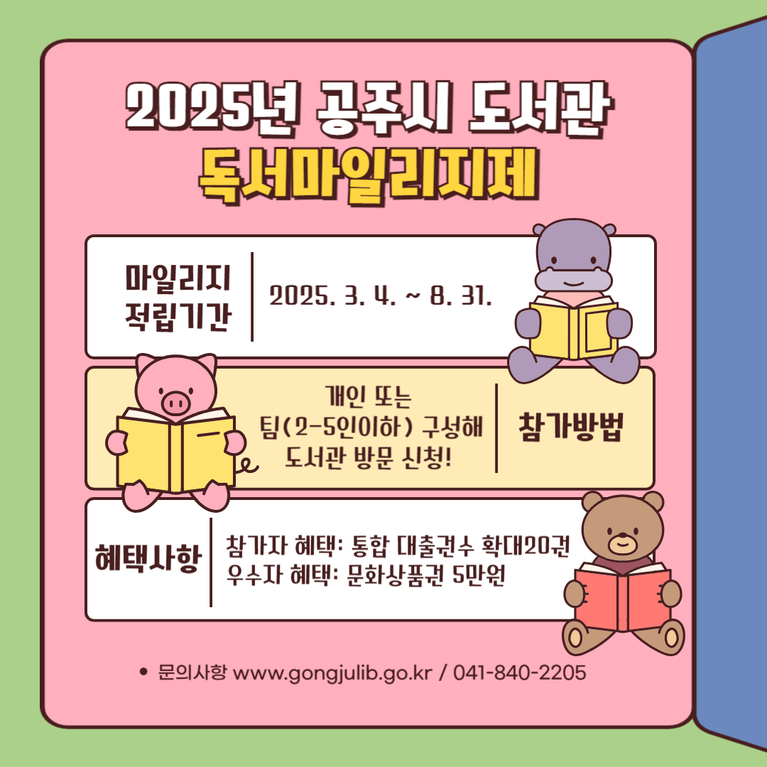 3~8월까지 마일리지 적립 및 우수자 40팀 문화상품권 5만원 혜택 공주시(시장 최원철)는 시민들의 독서 활동을 격려하고 도서관 이용을 활성화하기 위해 오는 3월부터 독서마일리지제를 운영한다고 10일 밝혔다. 독서마일리지제는 도서관에서 도서를 대출하거나 프로그램에...