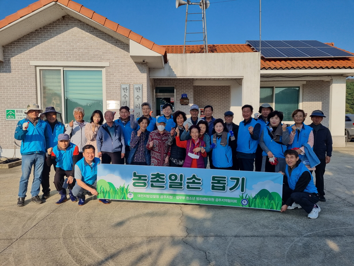 공주시 이인면 만수리, 지난해 공주지청과 1사 1촌 자매결연 공주시 이인면(면장 노수예)은 지난 24일 대전지방검찰청 공주지청 및 청소년범죄예방위원회 공주지역협의회와 함께 만수리에서 환경정화 활동을 펼쳤다고 밝혔다. 이날 봉사활동에는 김민구 공주지청장과 강석우 공주지역협의회장 등...