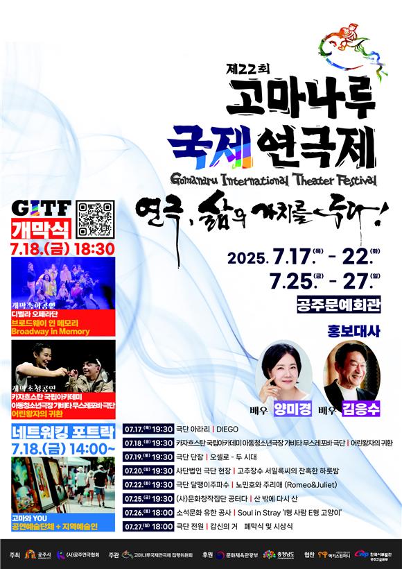 19일부터 27일까지 경연작품 선보일 예정 ㈔한국연극협회 공주시지부가 주최하고 공주시와 고마나루국제연극제 집행위원회가 주관하는 제22회 공주 고마나루국제연극제가 18일 공주문예회관에서 개막식이 개최됐다. 2025년 구호를 ‘연극, 삶의 가치를 두다!’로 정하고, 7월 17일부터 27일까지 7일간의...