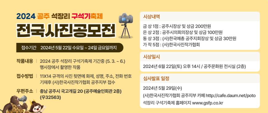 지난 5월 3일부터 공주 석장리에서 진행된 ‘석장Re(ㄹ) 1964), 구석기 세계로!’ 행사를 주제로 한 사진대회 전수가 시작됐다. 시상은 금, 은, 동, 가작으로 나누고 총상금은 490만원이다. 접수기간은 5월 22일부터 24일까지로 5월 29일...