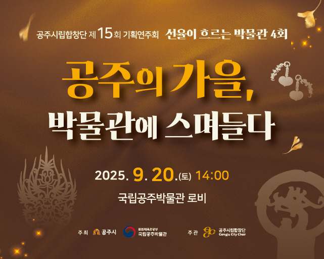 가을의 정취 속 선율이 흐르는 특별한 박물관 무대 공주시(시장 최원철)는 오는 20일 오후 2시 국립공주박물관 로비에서 공주시립합창단 제15회 기획연주회 ‘공주의 가을, 박물관에 스며들다’를 개최한다고 밝혔다. 이번 공연은 공주시와 국립공주박물관이 공동 주최하며,...